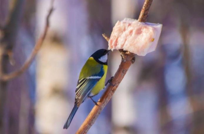 Отдельно следует сказать о сале, оно помогает создать жировую прослойку на теле, чтобы не замерзнуть в лютые морозы. Его кладут в кормушку или подвешивают на веревочку. Но! Соленое, маринованное и копченое сало синицам давать нельзя.