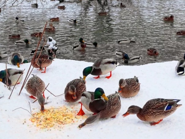 Отдельно следует сказать про уток, которые считаются перелетными птицами. Многие из нас наблюдают их зимой в парках, где есть водоемы и очень любят их кормить. К такому образу жизни уток приучили люди, которые подкармливают их круглый год. Вот и перестали улетать утки из больших городов в теплые края.