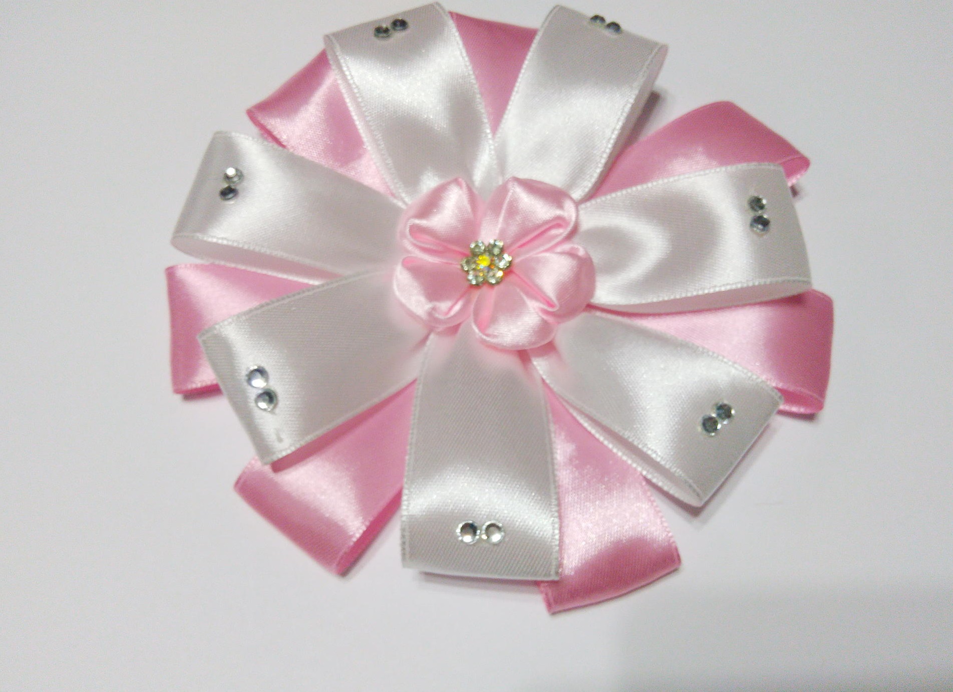 Украсьте края и середину ленточного банта стразами. Теперь полученный бант можно прикрепить на большую широкую ленту розового или белого цвета и использовать для выписки малышки.