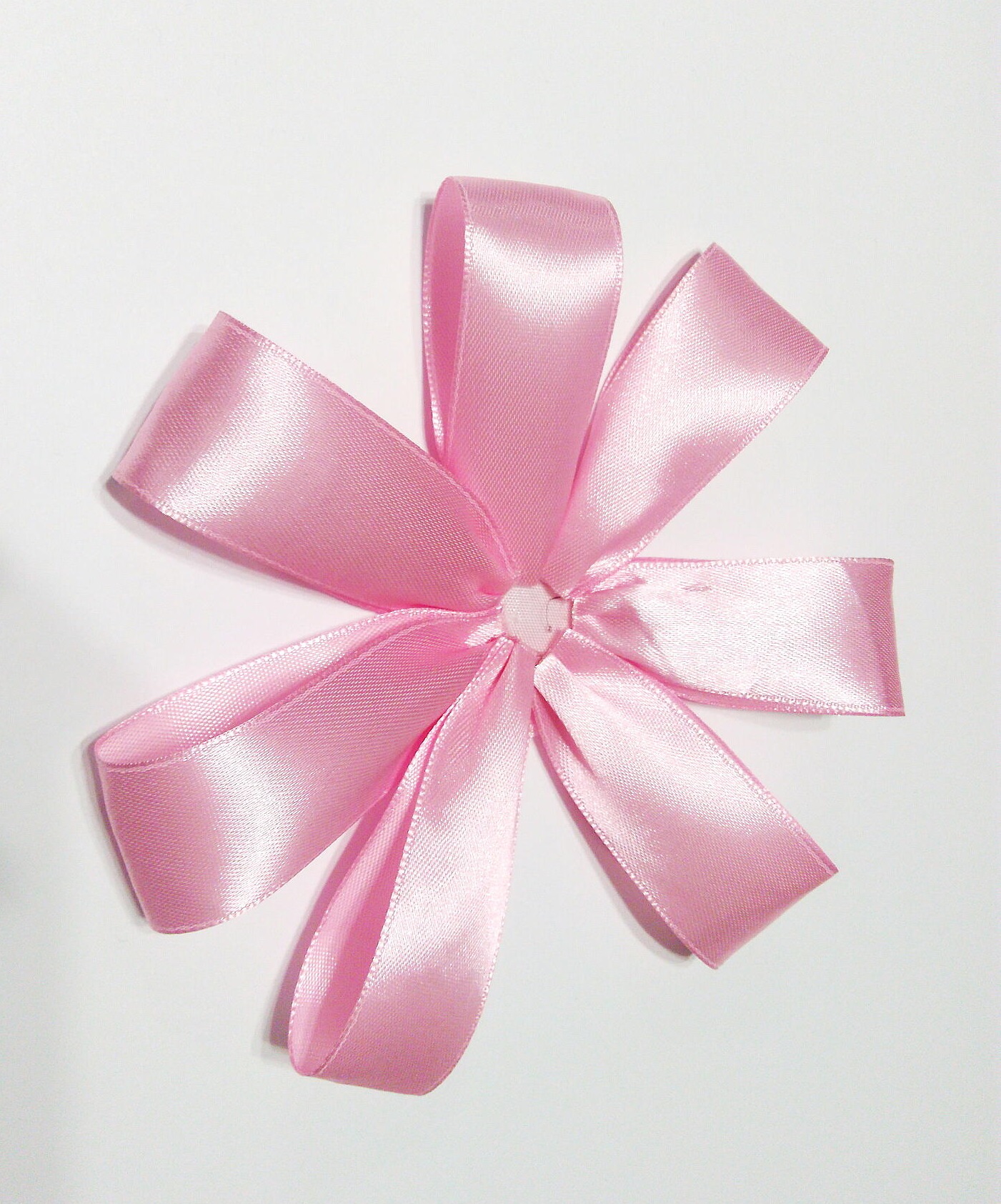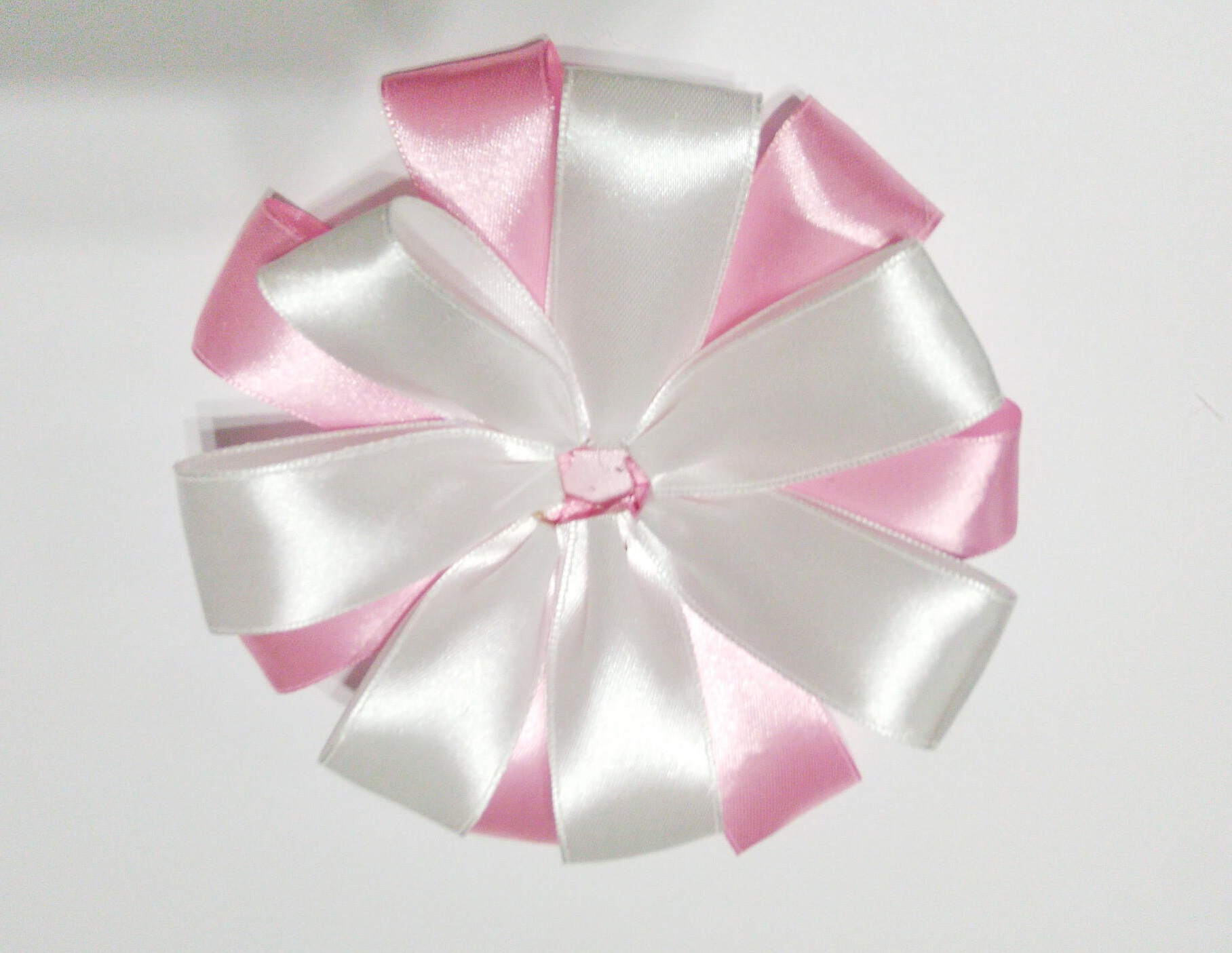 По аналогии делаем еще 7 белых лепестков. Скрепляем их по кругу горячим клеем, приклеивая между розовых лент. Для надежности лепестки можно сшить. Для этого используйте нити белого или розового цвета.