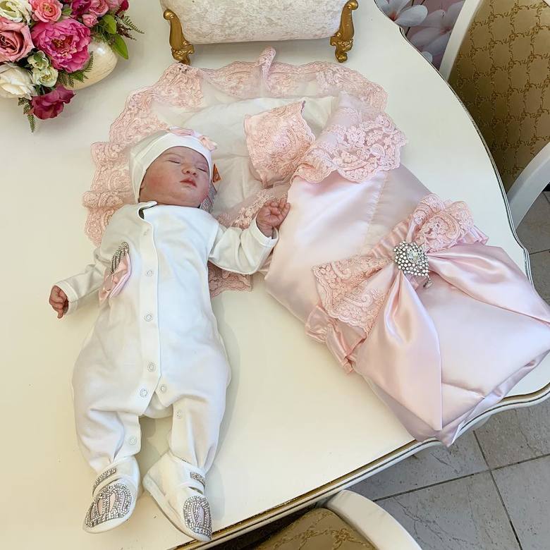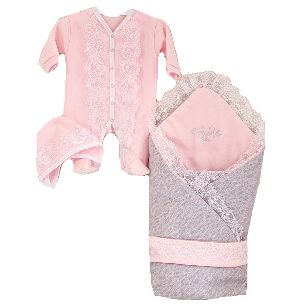 - Одеяло или лёгкий конверт для выписки. К нему должны прилагатьс я элементы, фиксирующие малыша, бант или поясок. Заменить одеяло можно красивым уголком из тонкой ткани с рюшевым краем и расшитыми бусинами.