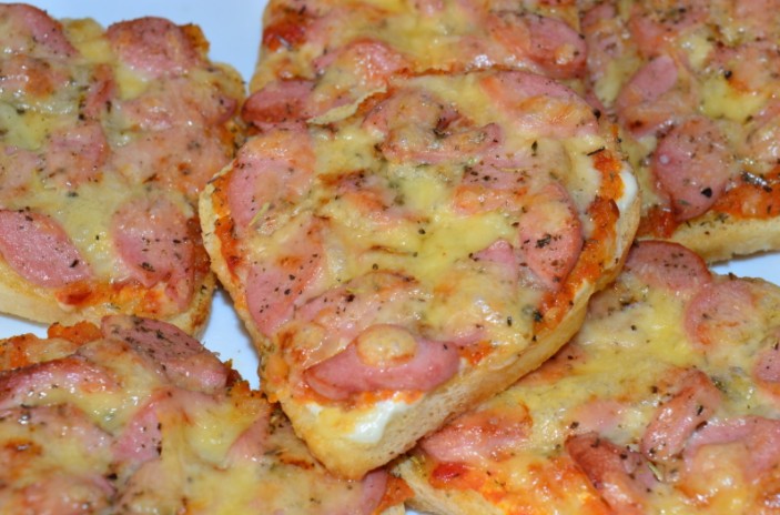Не смотря на то, что такая пицца отличается от настоящей, это отличный вариант для завтрака. Кроме кусочков белого хлеба, потребуется копченая колбаса, натертый сыр и кетчуп.