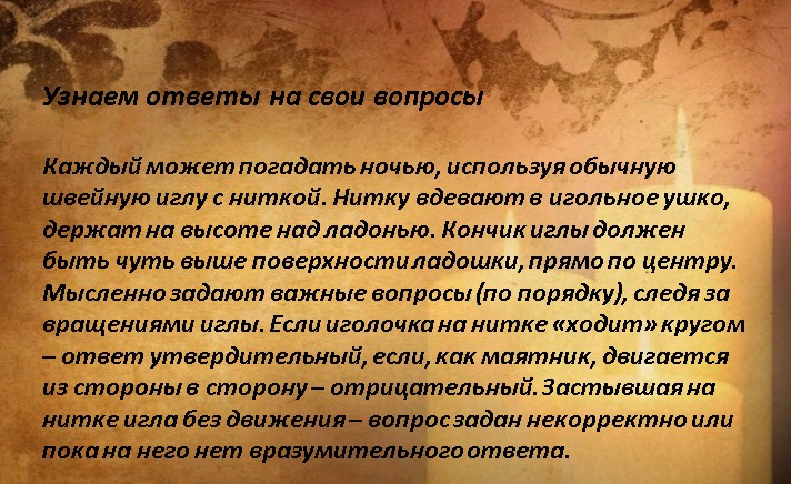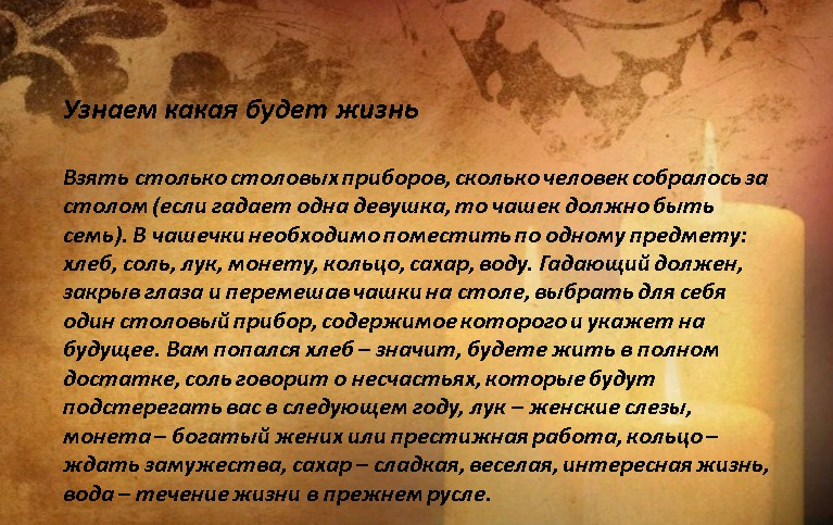 - Вечером — можно узнать о своей дальнейшей судьбе, спросить о замужестве или женитьбе, какой будет год и что от него ждать, где искать суженого, в какой стороне. Так же, ответы можно получить на вопросы, которые касаются здоровья и денег.