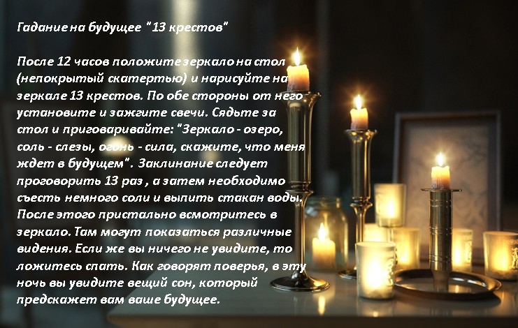 - В полночь — получить информацию о внешности будущего жениха, какого цвета у него волосы, глаза, будет старше или младше, счастливая ли будет семейная жизнь, сколько детей предначертано судьбой. Ожидает ли скорое замужество, богатый будет год или бедный.