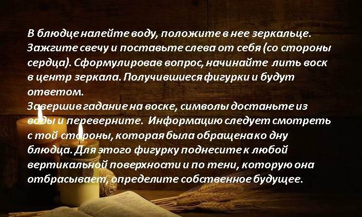 Для гадания на Рождество воск используют очень часто, чтобы его получить, покупают освещенные в храме свечи. Принцип заключается в том, что нужно капать расплавленным воском на пустое блюдо или на воду, а когда он застынет, пытаться разгадать, что за фигура получилась. Это и будет результат гадания, по которому определяют чего ожидать от жизни. Если вы используете при гадании воду, рекомендуется взять талую, зимой это сделать очень легко, просто растопите снег.