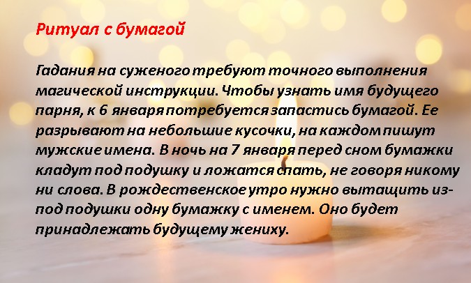 Кто из девушек не хочет узнать, каким будет ее будущий супруг! С помощью гадания сделать это легко, а если ритуал проводится на Рождество, следует сказать, что это самое подходящее время. В зависимости от выбранного способа гадающая сможет многое узнать о своем суженом — от того, как он будет выглядеть, до его имени.