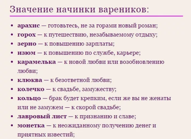 Когда гости расселись, хозяйка ставит на стол блюдо с варениками. Каждый из присутствующих берет по варенику. В зависимости от начинки определяют, чего следует ожидать в наступившем году.