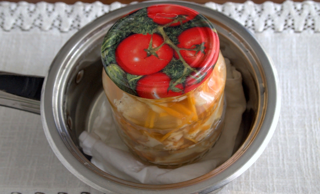 В кастрюлю на полотенце выставляем наши банки, заливаем меж банок теплую воду до плечиков. Включаем огонь, после кипения на медленном огне выдерживаем емкость 15 минут, вынимаем банки и закатываем их винтовыми крышками или под ключ-автомат. Банки отставляются в сторону, остывают и выносятся в кладовую или на балкон.