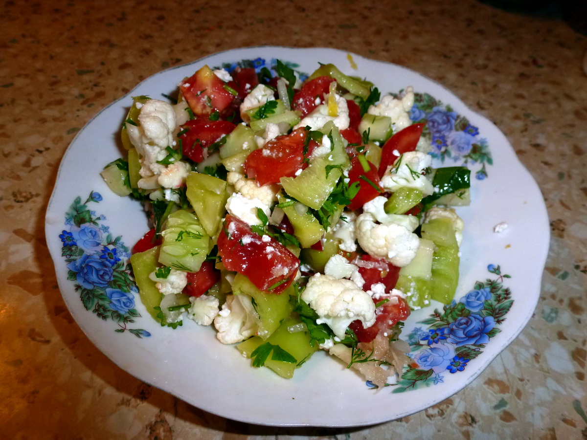 Не только из помидоров и кабачков могут получаться вкусные зимние салаты. Цветная капуста запросто может составить конкуренцию перечисленной консервации. Рецепты приведенных ниже блюд особенно выгодно будут смотреться на праздничном столе.