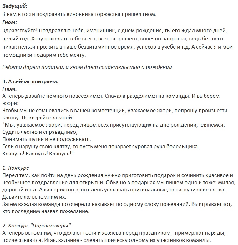 Главные лица по сценарию-ведущий, гномик, именинник, ну и конечно же гости. Ведущий в ходе праздника разделит детей на команды. Состав команды зависит от количества приглашенных детей.