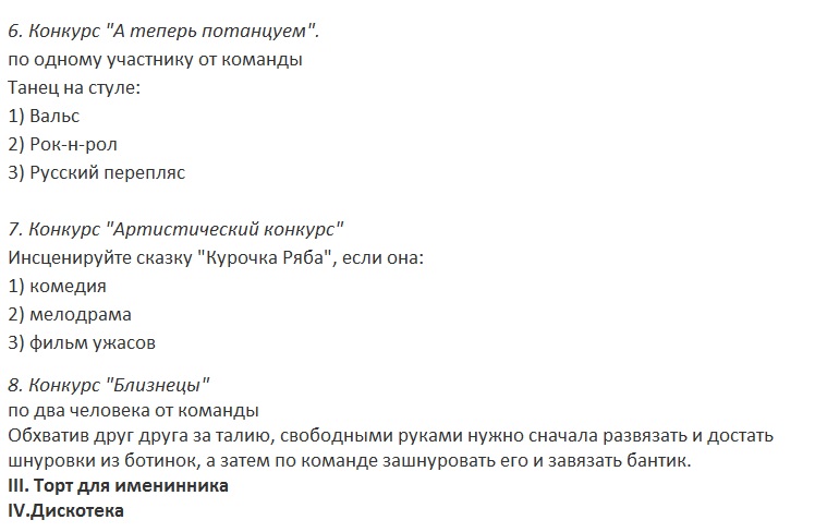 Взрослый день рождения требует большей подготовки и ответственности чем детский. Предварительно нужно просчитать на какой период времени растянется мероприятие. Исходя из этого времени планируются вся развлекательная программа. В нее необходимо включить не только конкурсы, но и время на застолье, танцы.
