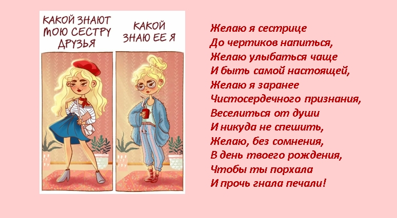 Поздравить собственную сестру с Днем ее рождения, святое дело, какие бы не были у вас отношения, особенно в детстве. Прикольный стих или открытка поднимут настроение, главное не переборщить и не обидеть близкого человека.
