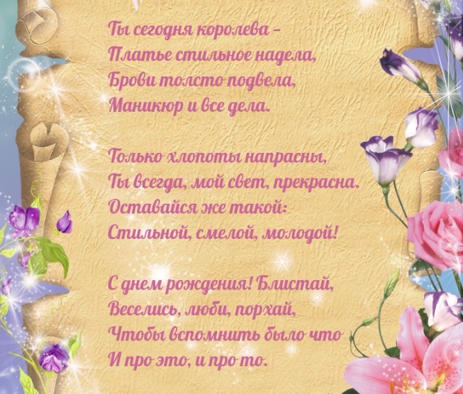 Для женщины особенно важно, чтобы в поздравлениях оценили ее красоту и неповторимость. Так доставьте же ей такую радость, отметьте ее молодость, сколько бы лет ей не исполнилось и пожелайте всех земных благ, о которых мечтает любая представительница прекрасного пола.