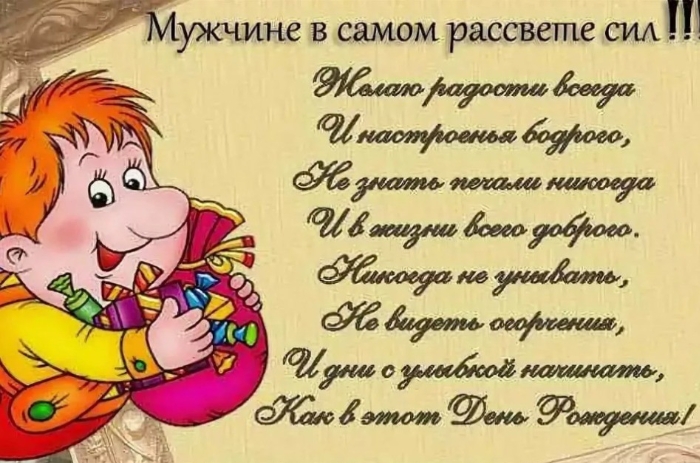 Мужчина считается кормильцем семьи, для него самое главное, это состояться в профессии, заработать и иметь возможность приобрести материальные блага. Не забудьте в своем поздравлении всего этого пожелать сильному представителю человечества. Ну и еще, конечно, прекрасного настроения.