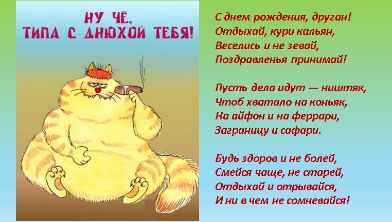 В этом разделе вы можете выбрать варианты юморных поздравлений любому человеку из вашего окружения. Это может быть коллега, приятель, сосед или родственник. Рекомендуем сначала убедиться, что именинник обладает чувством юмора и правильно вас поймет.