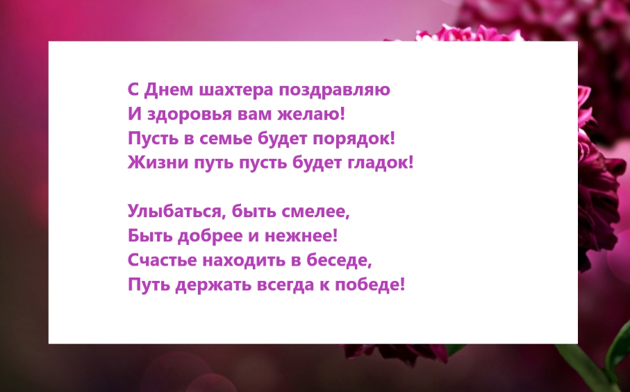 Приветствую вас, дорогие коллеги, и поздравляю с профессиональным праздником — Днем шахтера! Этот праздник касается не только шахтеров, но и их семей, ветеранов угольной промышленности. Это нелегкий труд быть горняком армии (наименование шахты). Каждый из вас — это звено, которое объединяет в единую цепь нашу отрасль. Вместе мы идем к новым глубинам и новым результатам, которые выходят нас на новую вершину экономики. Жаль, что только день в году выделен под чествование вас — наших горняков. Это нелегкий ежедневный труд, который стоит восславлять ежедневно. Находясь в шахтах, наши люди каждую минуту рискуют своей жизнью, добывая для блага народа жизненно необходимое сырье. Я желаю вам, чтобы и в ваших домах всегда было тепло, близкие и родные всегда дожидались вас и встречали с улыбкой. Пусть в ваших семьях будет нерушимый мир и благосостояние. С праздником дорогие друзья!