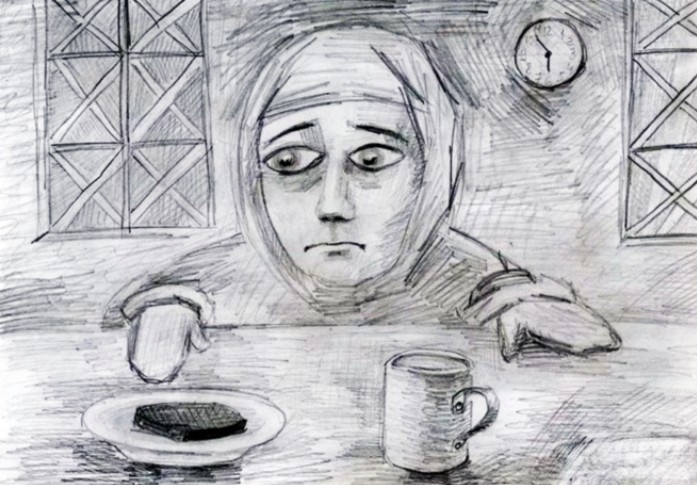 - Сначала нарисуйте девочку, сидящую за столом и смотрящую на маленький кусочек голодными глазами.
