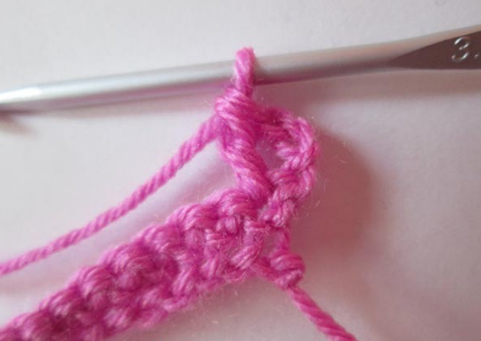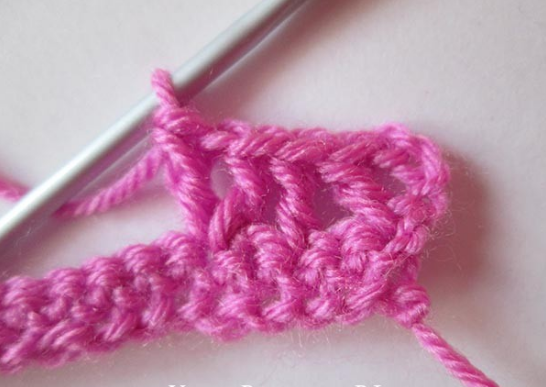 Отсчитать 2 петл. в основании. Во 2-ю вязать столб. с накид. Затем — пропускаем петл. у основ., столб. с накид. и 1-у воздуш. петл. Сюда — 1-н столб. с накид.
