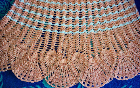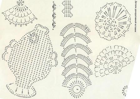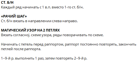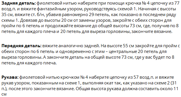 Верхняя часть — столб. с накид., 2 водуш. петл.. Раппорт — 10 петел. фил. рис., 14 петел. цветк.(по схеме)., одна воздуш. петл., 14 петел. цветк., 10 петел. фил. сетки.