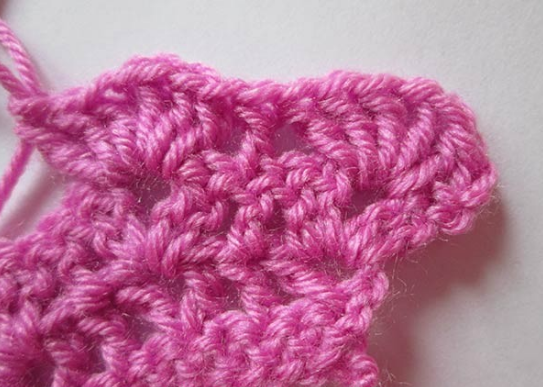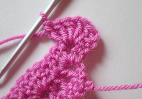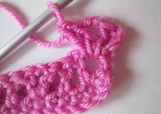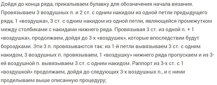 Новый ряд — 1-й столб. с накид. — меняем на 3 петл., затем в арку, образованную воздуш. петл. предшеств. ряда., столб. с накид. Воздуш. петл. — сюда 2 столб. с накид.