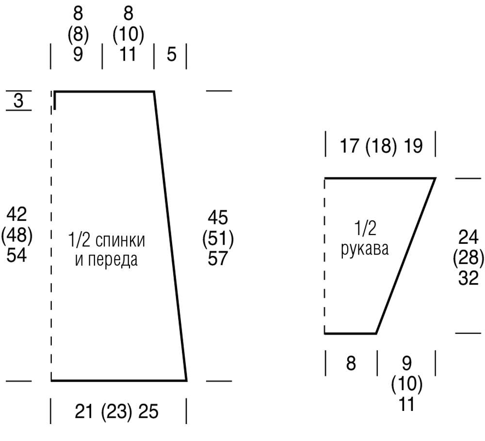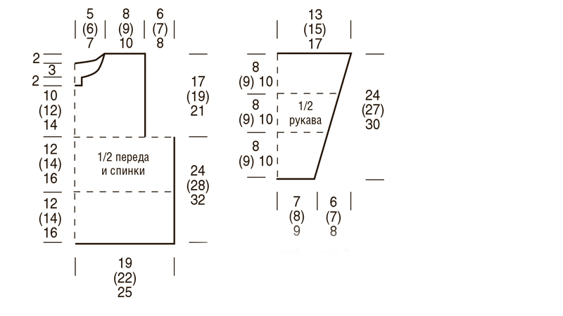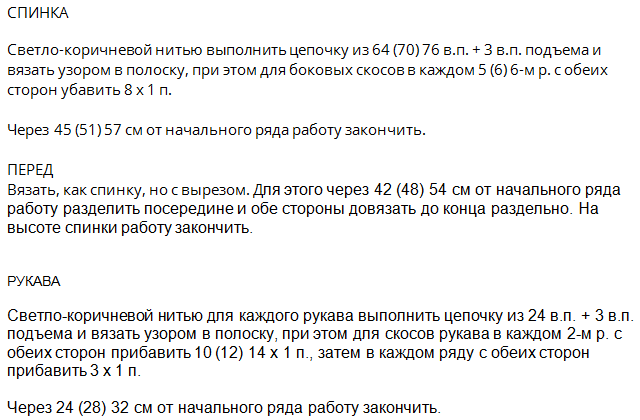 В каждом ряд. вяж. 2 столб. из 1-ой и посл. петл. Спинка — не добавляем по центру столб.