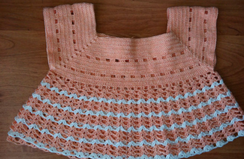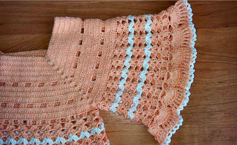 Модель для девочки 6-8 месяцев на теплую солнечную погоду. На спинке — застежка. Юбка вяжется поперек кокетки.