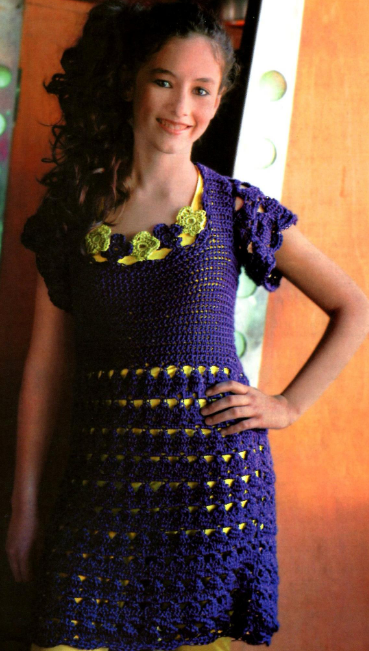 Платье фиолетовое с желтой отделкой. Для этого платья, приготовьте акриловую пряжу — 500 грамм, фиолетовую, 20 грамм — зеленую, крючки номеров 3,5 и 4.