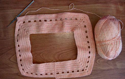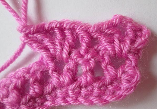 Вяжем 2 столб. с накид. (над столб. предшествующего ряда). Далее — 2 воздуш. петл. Далее — столб. с накид. между столб. 2-го ряда. Еще 2-е петл. — столб. с накид., провяжите в больш. отверстие. В то же место еще столб. с накид. 2-е воздуш. петл. и 2 след. столб. еще раз провяжите в больш. отверст. После очередных 2-х воздуш. петел., провяжите их вместе со столб. с 1-м накид. между 4-мя столб. предшествующего ряда. Вяжем полностью ряд.