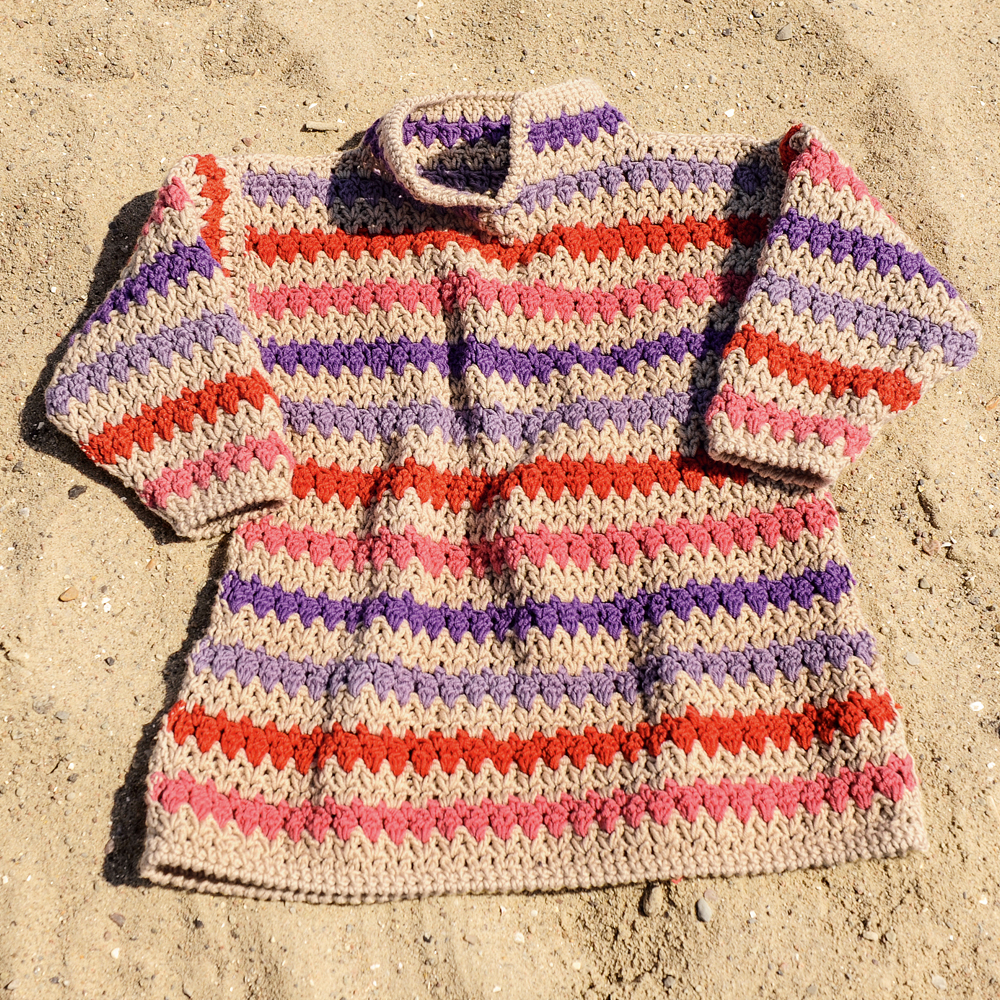 Обвязываем горловину, вырез на спине и рукава. Используйте черную нитку. Один р. полуст. с накид. Пришейте пуговицы. Петлей послужит отверстие в узоре.