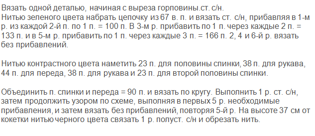 Приготовьте пряжу — 350 грамм. Цвет зеленый. Так же понадобится пряжа черного цвета. Вяжите крючком 3-го номера, плотность — 10 см Х 15.
