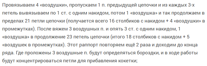 После булавк. — столб. без накид. Вяжем — 5 петел. воздуш. , провяз. 6-ю — в каждую 3-ю петл. предшествующего ряда. Петли образованные из 5-ти воздуш.- из низ вяжем 3 столб. с накид. Таким образом с каждой дужкой. Затем — из одной петл. — 2 столбик. с накид., след. — 1 столб. с накид. Пропускаем одну петл., повтор до окончания ряда. Повторить п. 3, 4, 5.