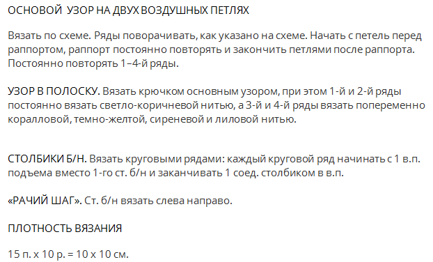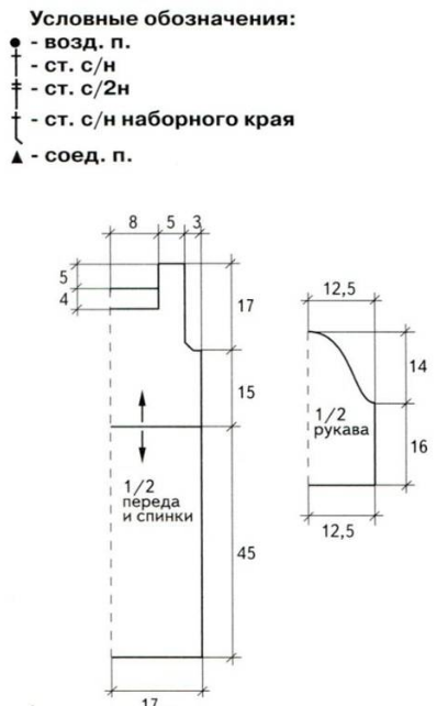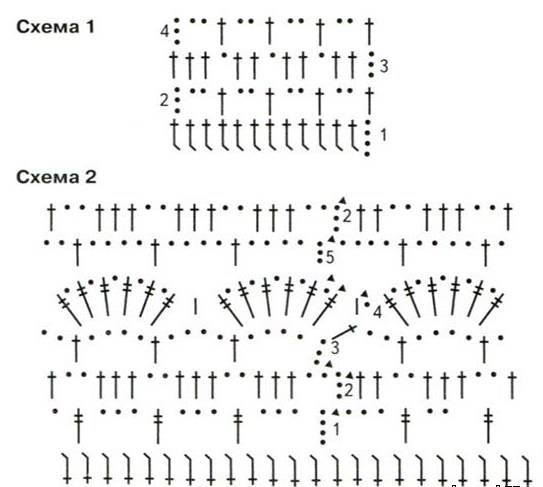 Вяжем верх — схема 1., спинка (сеткой) — схема 1. Затем сшиваем по швам.