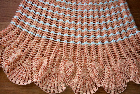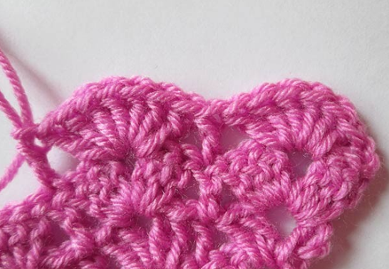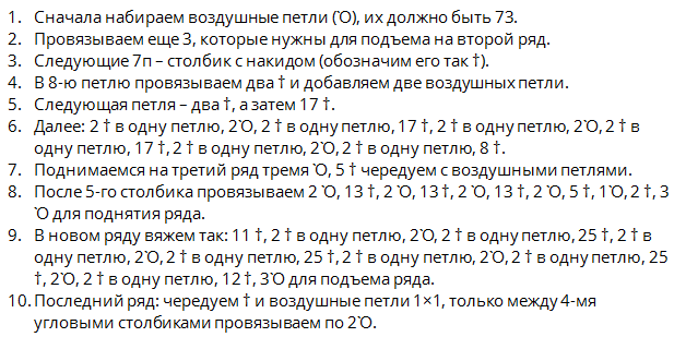 8-й ряд — 3 воздуш. петл. провязать совместно с 3-мя столб. с накид. в ближайшее отверств. (от крюч.) Выполняйте 3 петл. В столб. предшествующего ряда — столб. с накид. и опять 3 петл. Затем вяжем как 2-ой ряд, но заместо 2-х петел. воздуш. — 3. 8-й ряд — заверш.