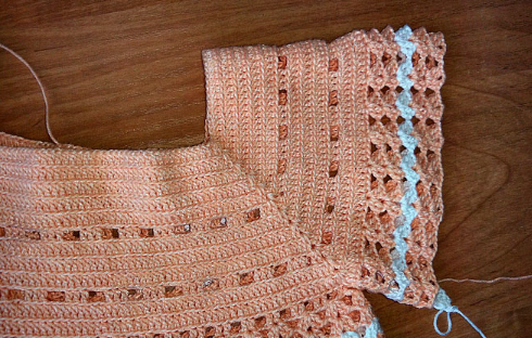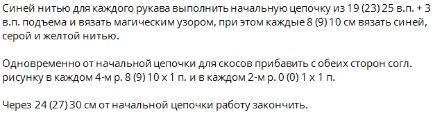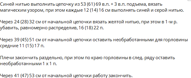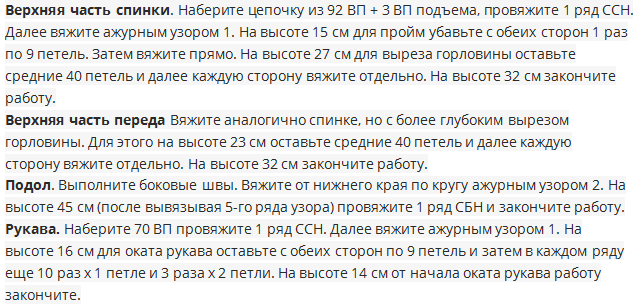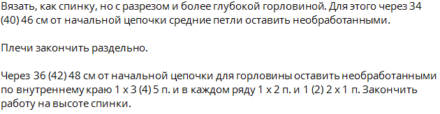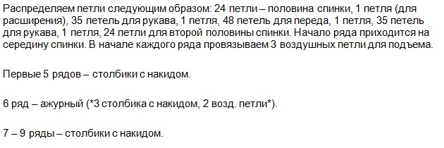Петл. спинки и переда оставляем для дальнейшего вязания (подола) 3 столб. с накид. 2-е петл. воздуш.