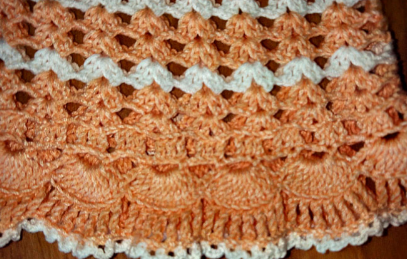 Когда кокетка у вас, будет готова, сшейте ее с двух сторон. Далее берите нить белого цвета и приступайте к вывязыванию нижней части платья. Узор представлен на рисунке ниже, который называется Ананас. Следуя узору, нужно делать одинаковые прибавления во всех рядах.