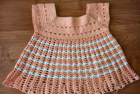 Чтобы не ошибиться с размером, рекомендуется одеть на плечи девочки и соединить кокетку в подмышках. Если кокетка натягивается, т.е. мала, довязать, если большая — немного распустить.