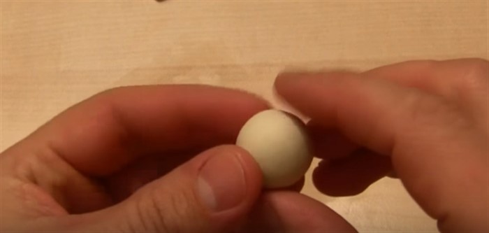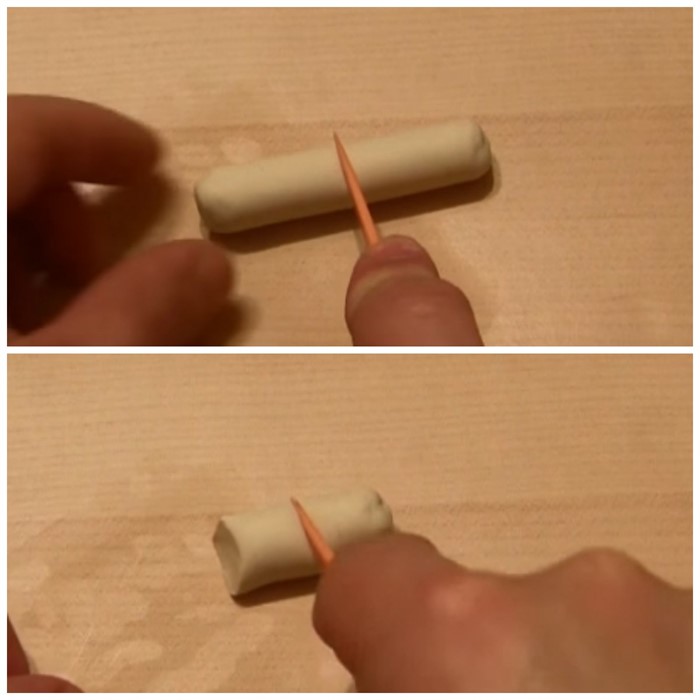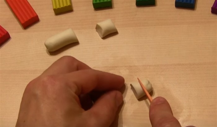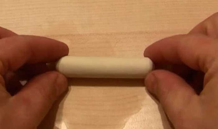 - Кусок белого пластилина стоит хорошо размять и скрутить в колбаску высотой примерно 7 см.