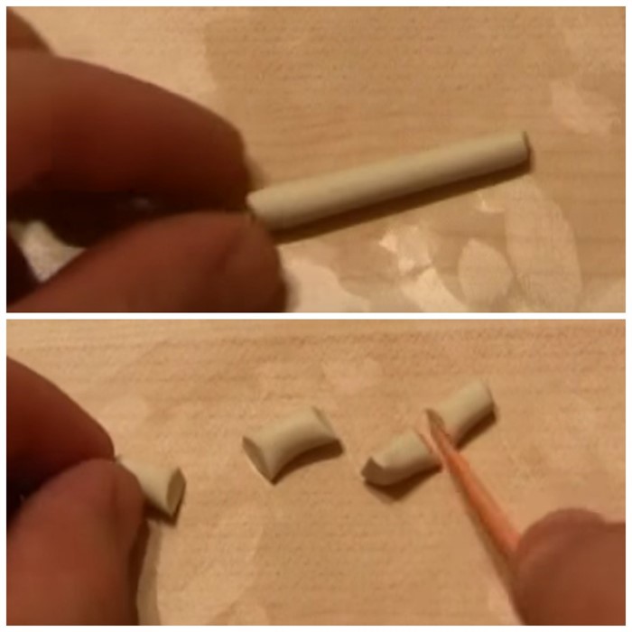 - Оставшийся кусочек раскатайте в тоненькую колбаску, поделите ее на 4 равные части.