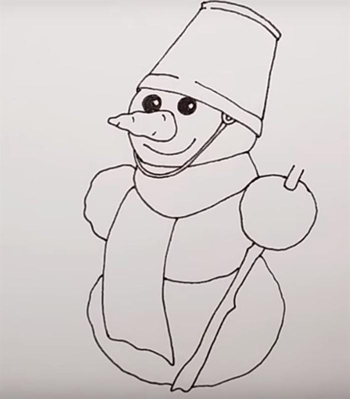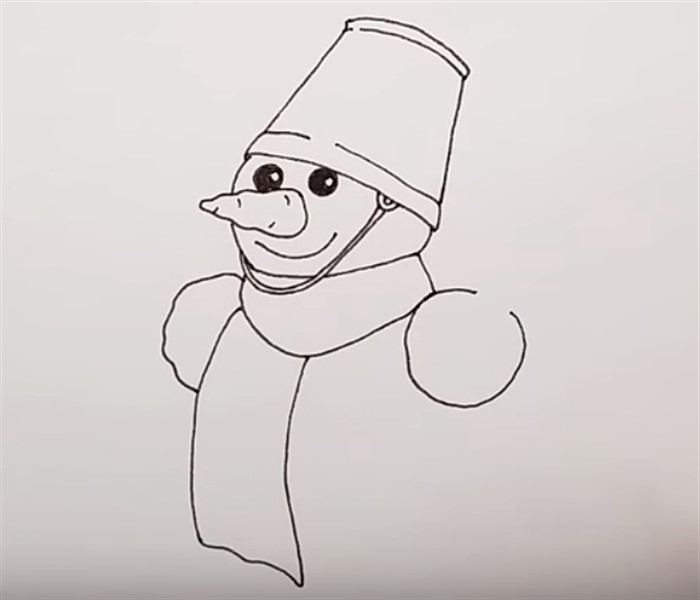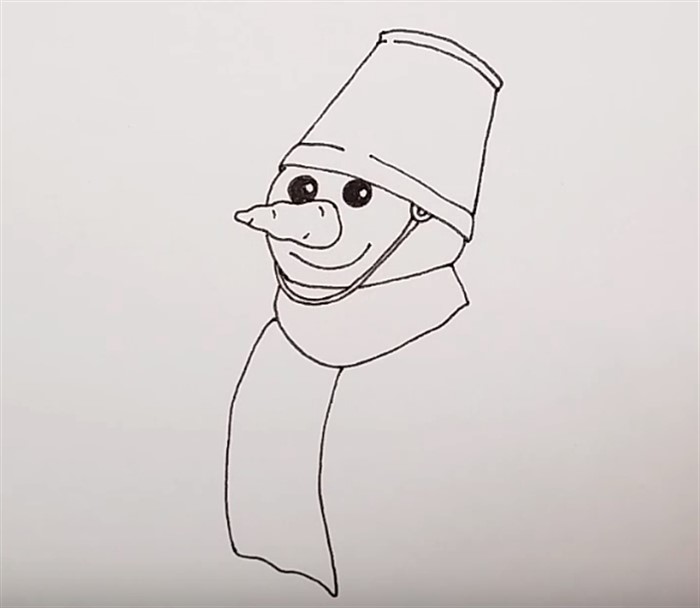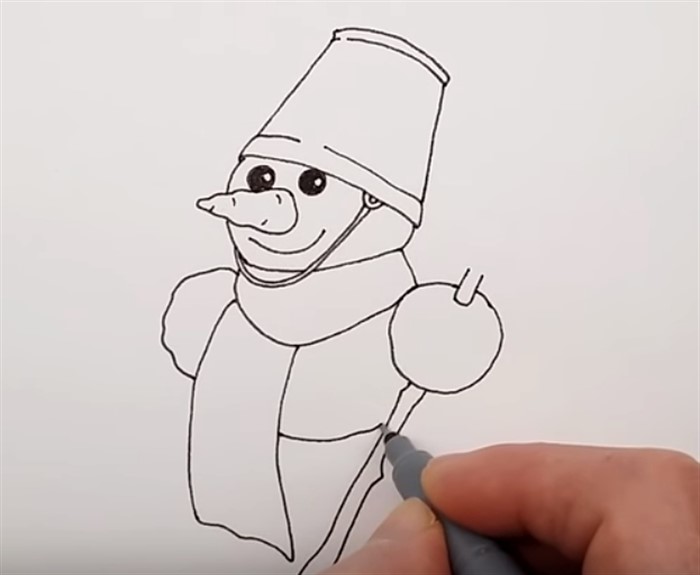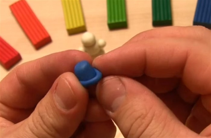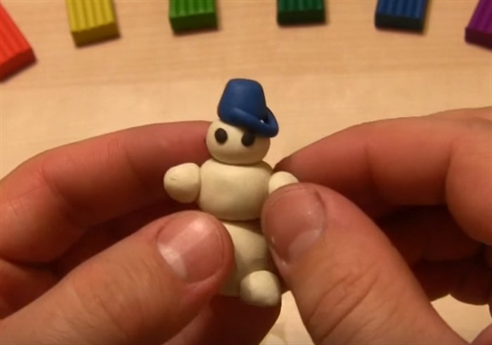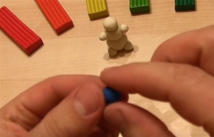 - Из маленького куска синего пластилина сделайте тонкую колбаску, прикрепите к предыдущей заготовке, сформировав ручку от ведра. Ведро прилепите к снеговику.