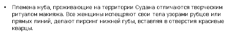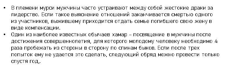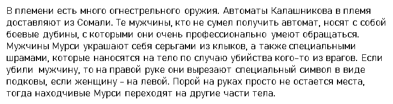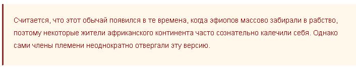 - В племени Мурси, тело женщин изуродовано татуировками. Делаются они следующим образом — надрезается кожа, в место надреза помещаются личинки насекомых. После их гибели на теле остаются бугорки.