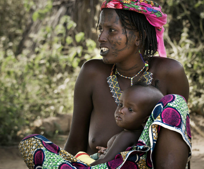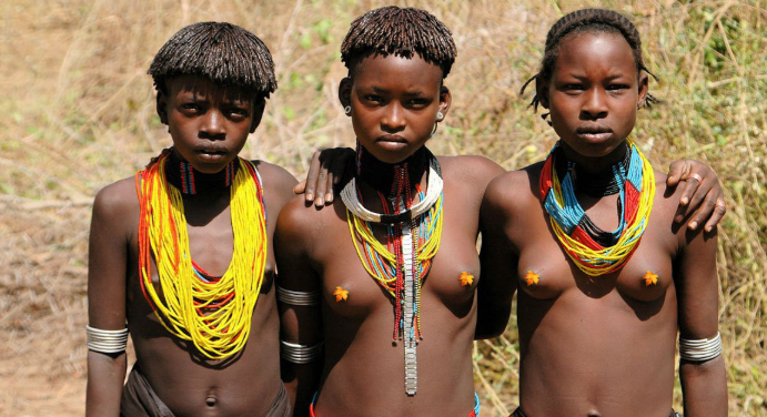Почти все африканские племена ходят голые, при чем верхнюю часть тела оголяют, а нижнюю, в большинстве случаев, закрывают. Но, характерно это не для всех. Например, племя Мурси ходят обнаженными, одевают только пояс на бедра. Туристы, посещающие племена в некоторой степени повлияли на обычаи и традиции этих людей, так как глазели на открытые части тела женщин. Но, открытое тело девушек, это показатель не легкодоступности, а норма жизни.