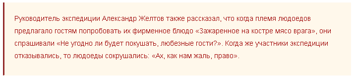 В 2010 году Международная исследовательская экспедиция обнаружила в джунглях Восточной Африки, рядом с Танзанией, русскоговорящее племя. Что удивительно, племя разговаривает на чистейшем образце языка 19 века, которым изъяснялись только дворяне. Кроме этого, члены экспедиции поведали о людоедских пристрастиях дикарей.