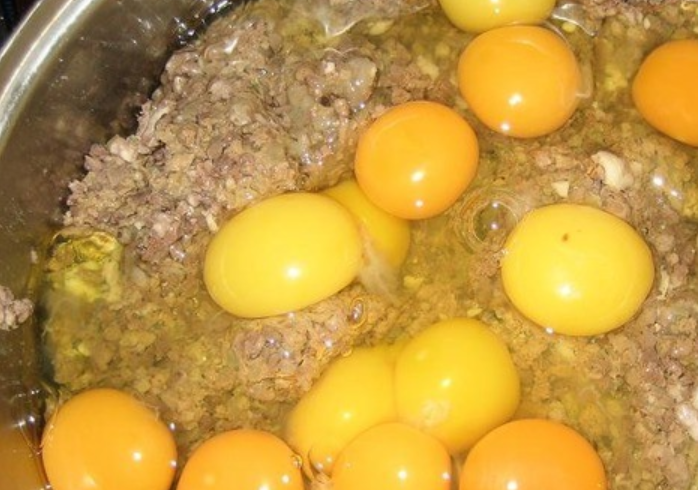 Прокручиваем все части в мясорубке вместе с луком. После того, как масса приобрела консистенцию однородности, добавляем яйца и перемешиваем.