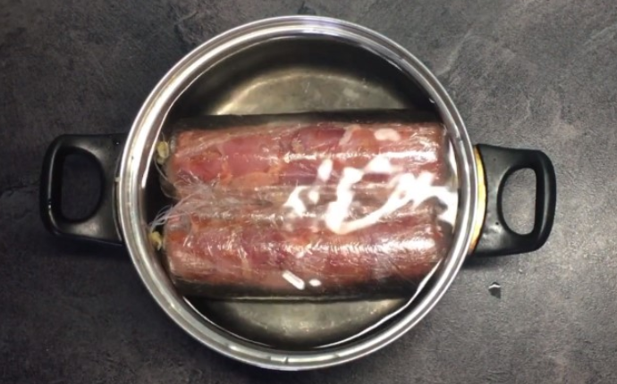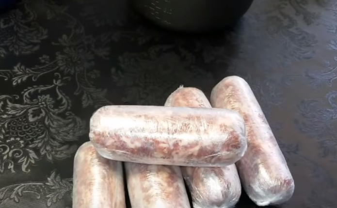 Традиционно колбасу готовят в кишках, заполняя их фаршем. Но, не всегда данный продукт есть под рукой. В этом случае можно заменить кишки обычной пищевой пленкой.