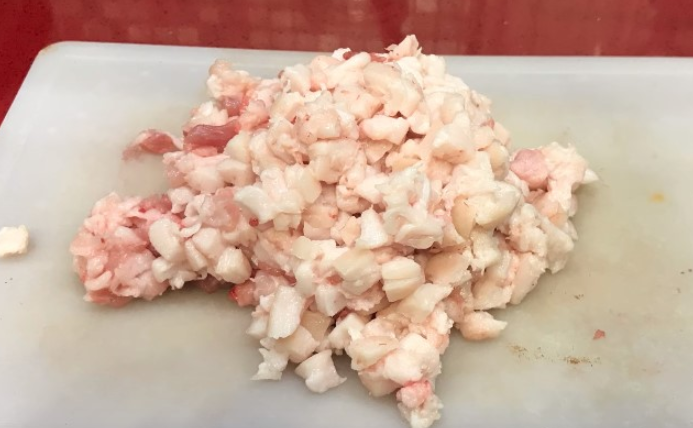 Мясо доставайте частями, его температура не должна повышаться. Обработали, достали следующую часть. Сначала — свинина, от нее нужно отрезать мясную часть и положить в холодильник. Сало режем на кубики, приблизительно 5 на 5 мм и тоже убираем в холодильник.