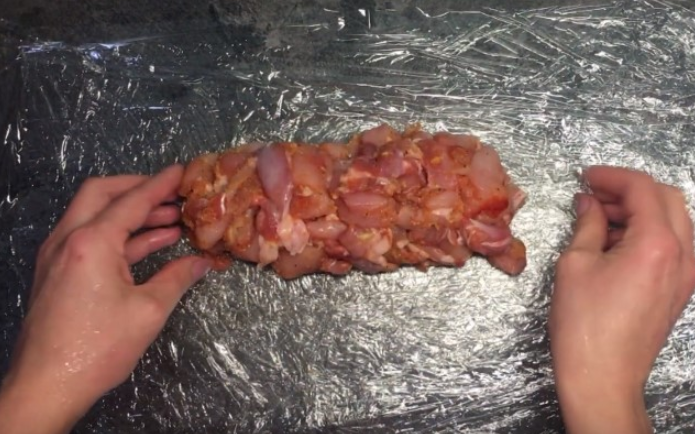 Берем пленку и стелем ее на стол в 4 слоя, выкладываем 1/2 часть подготовленной курицы.