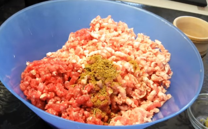 Добавляем все специи и хорошо мешаем. Обратите внимание, что чеснок предварительно измельчается. Переложите фарш в пакет и уберите на одни сутки в холодное место.