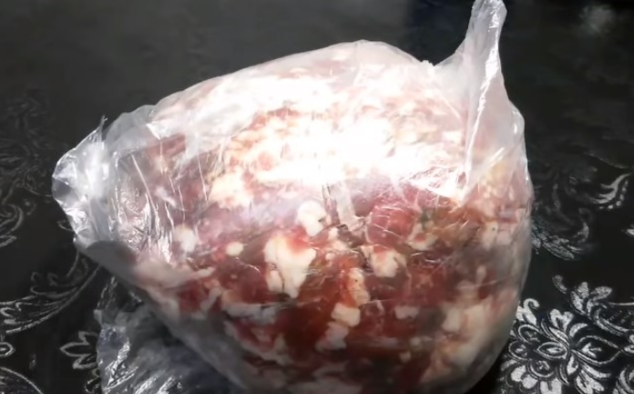 Фарш кладем в полиэтиленовый пакет и отправляем мариноваться на 2 дня в холодильник, чтобы мясо пропиталось ароматом специй и просолилось.