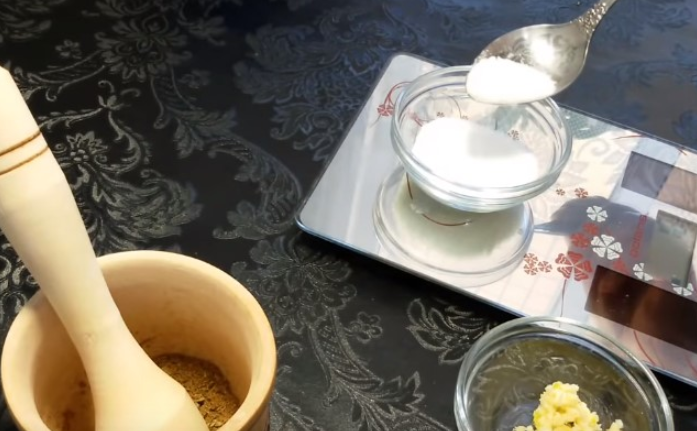 Все специи (тимьян, кориандр, мускатный орех по 1/2 ч.лож., черн., перец — 10 шт.) кладем в ступку и перетираем, пока не получится однородная масса. Соль следует взять крупного помола, на 1 кг — от 15 до 20 гр.