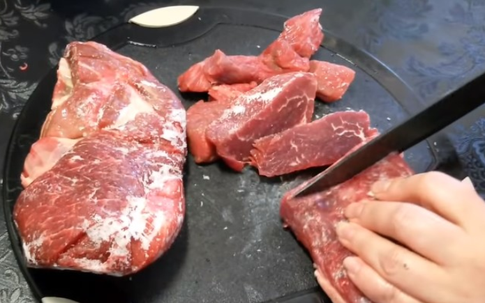 Важный момент! Не допускайте долгое размораживание, мясо должно быть не теплее 10-ти градусов, иначе при варке из него выйдет сок, что нарушит технологию.